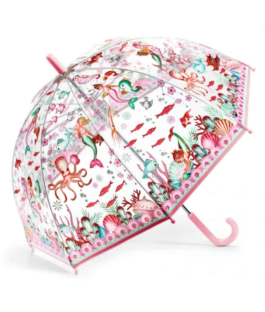 Djeco Kinderparaplu Zeemeermin. Leuke transparante kinderparaplu met leuke retro zeemeerminnenprint erop. Met deze paraplu is buiten in de regen lopen een feestje! De kunststof handgreep bevat een drukknopje waarmee zelfs kleine handjes de paraplu gemakkelijk kunnen openen. Wanneer de paraplu geopend is heeft hij een diameter van wel 70 cm.