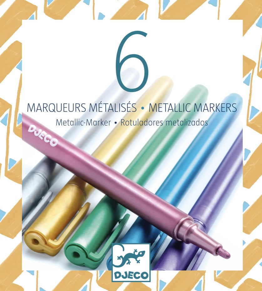 Versier, schrijf en kleur alles extra feestelijk met deze mooie metallic stiften van Djeco. De zes stiften in metallic kleuren hebben een glitter effect, en zijn daarom leuk om mee te schrijven, of om juist je tekening extra te versieren met een mooi accent!