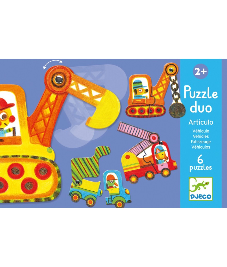 De duopuzzel Articulo Vehicles bestaat uit 6 kleurrijke, beweegbare voertuigenpuzzels. Als ze eenmaal zijn gereconstrueerd, kan je kind ermee spelen en verhalen verzinnen