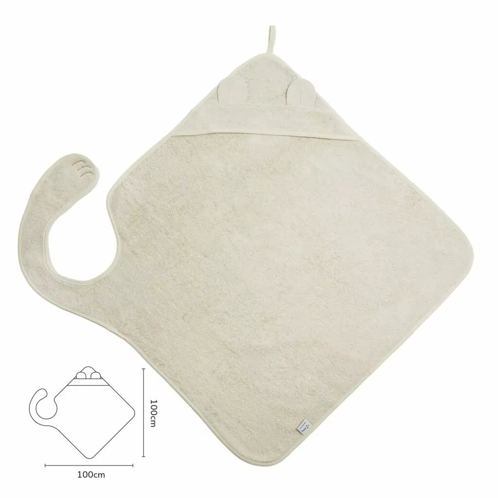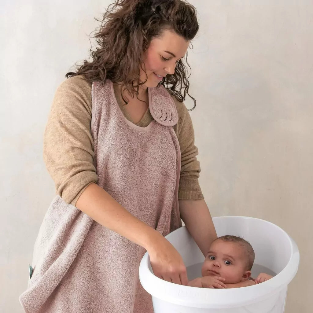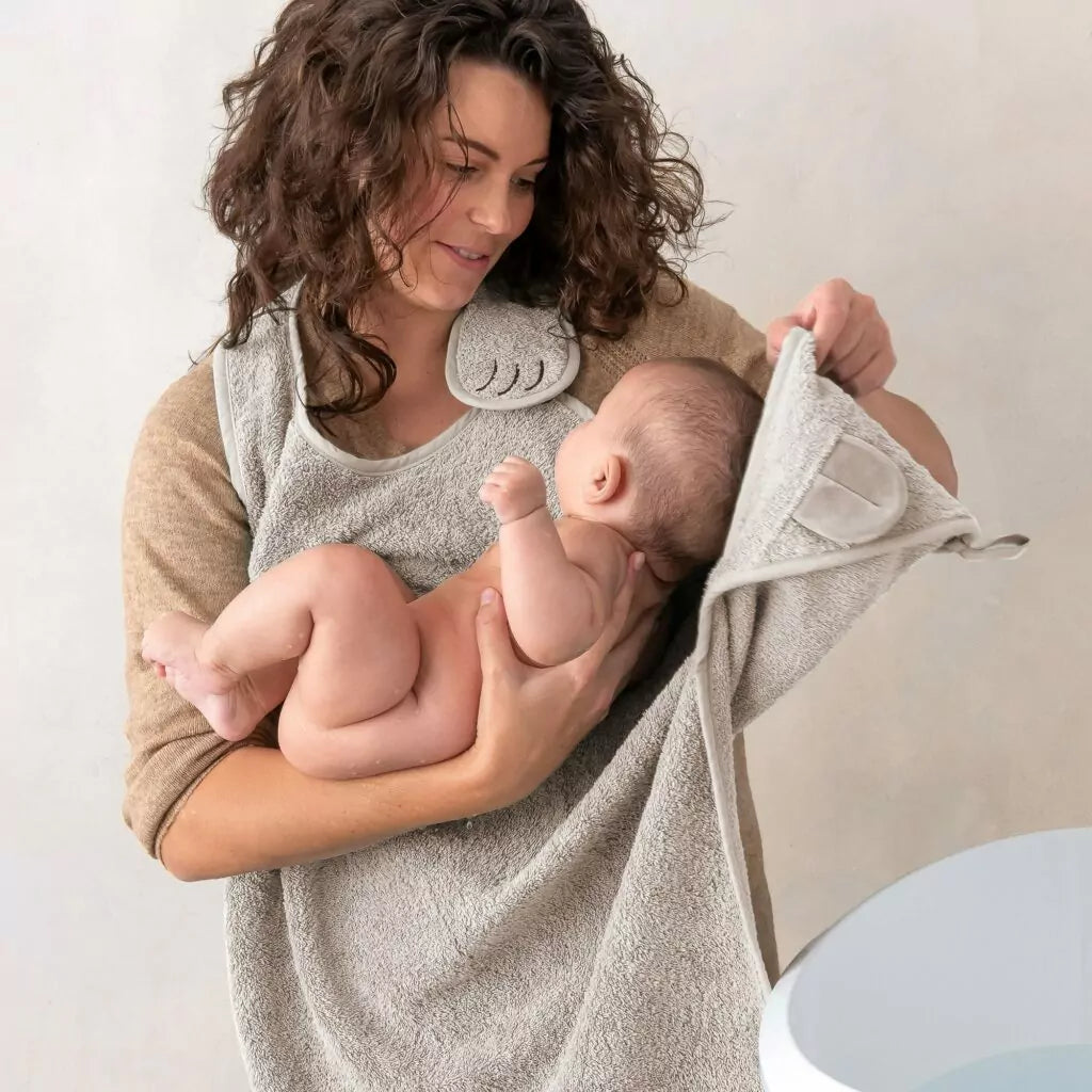 De handsfree badcape van 100x100cm bevat een dierenpootje met klittenband waarmee je de cape om kunt hangen. Dankzij het klittenband is de badcape gemakkelijk om te doen en los te maken. Het dierenpootje houdt de bad cape keurig op zijn plek, wat betekent dat de grote badcape je bedekt tijdens het badderen. Hierdoor blijf je zelf droog ondanks het gespetter van je baby tijdens het badderen. Bovendien heb je beiden handen vrij om je baby te ondersteunen en met gemak heerlijk warm in te wikkelen in de handdoek cape.