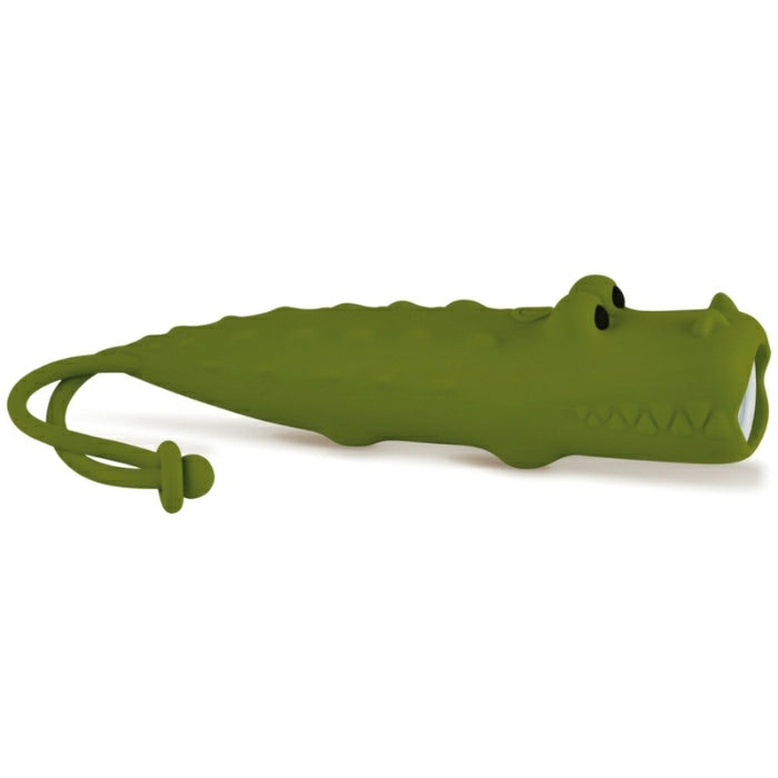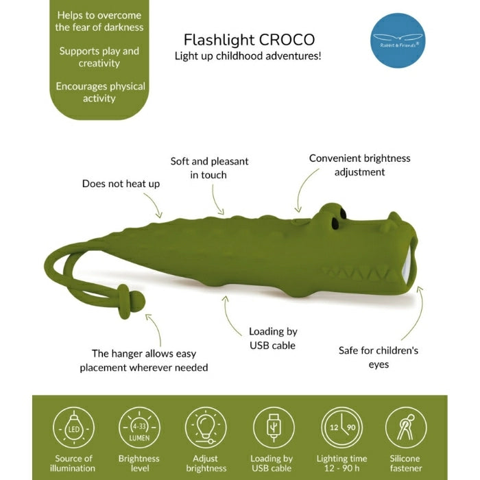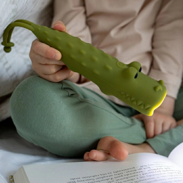 Croco-vormige zaklamp, bedekt met zacht siliconen, is de perfecte combinatie van functionaliteit en plezier. Dankzij de handige helderheidsregeling is hij ideaal voor avondavonturen, schaduwspel of verhaaltjes voor het slapengaan. Oplaadbaar via een USB-C-kabel, biedt hij comfort en lange gebruiksuren. De hanger maakt het eenvoudig om de zaklamp op te hangen waar hij nodig is.