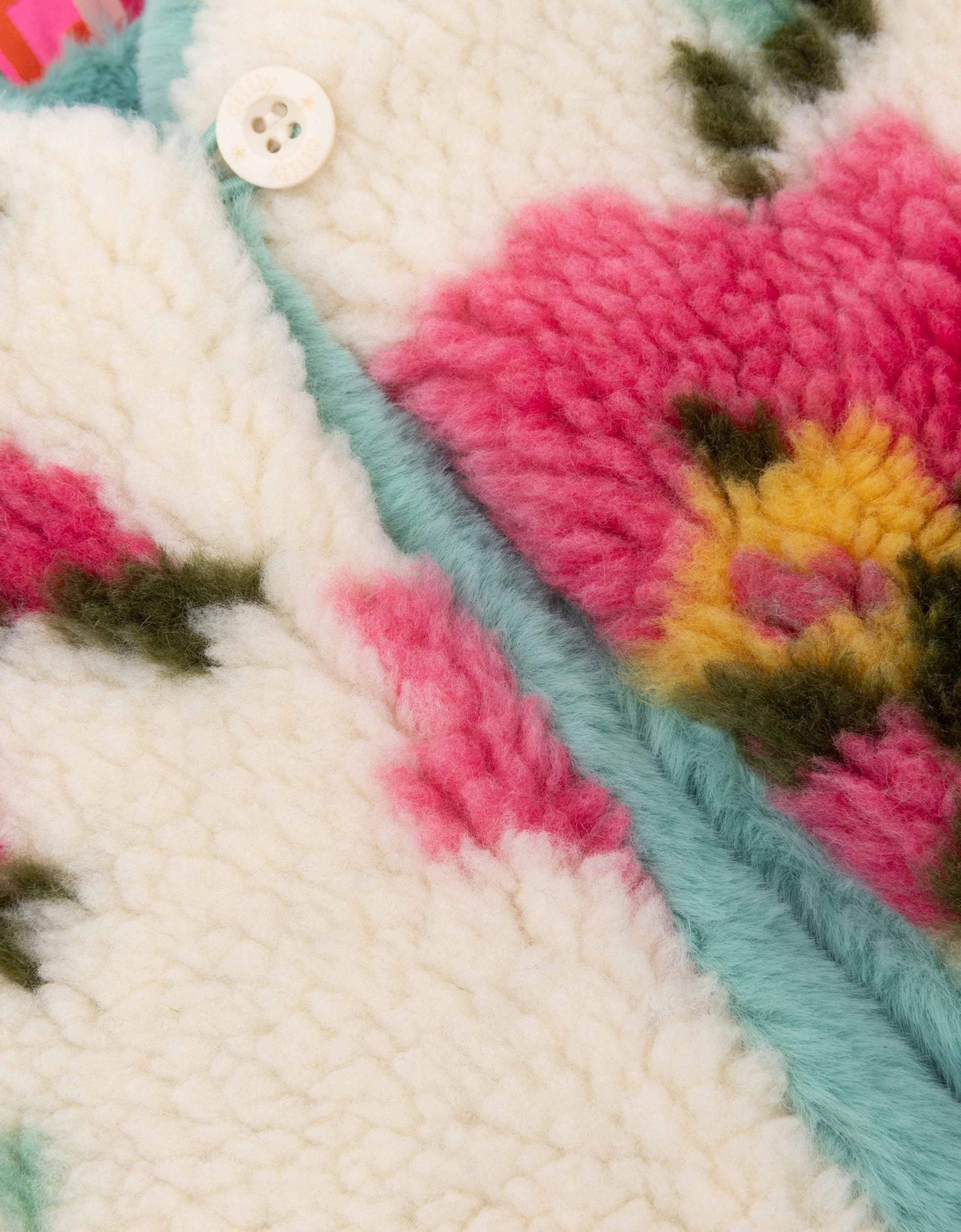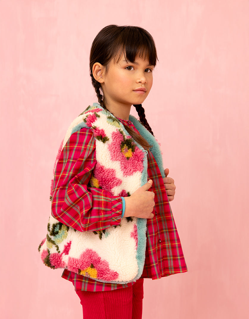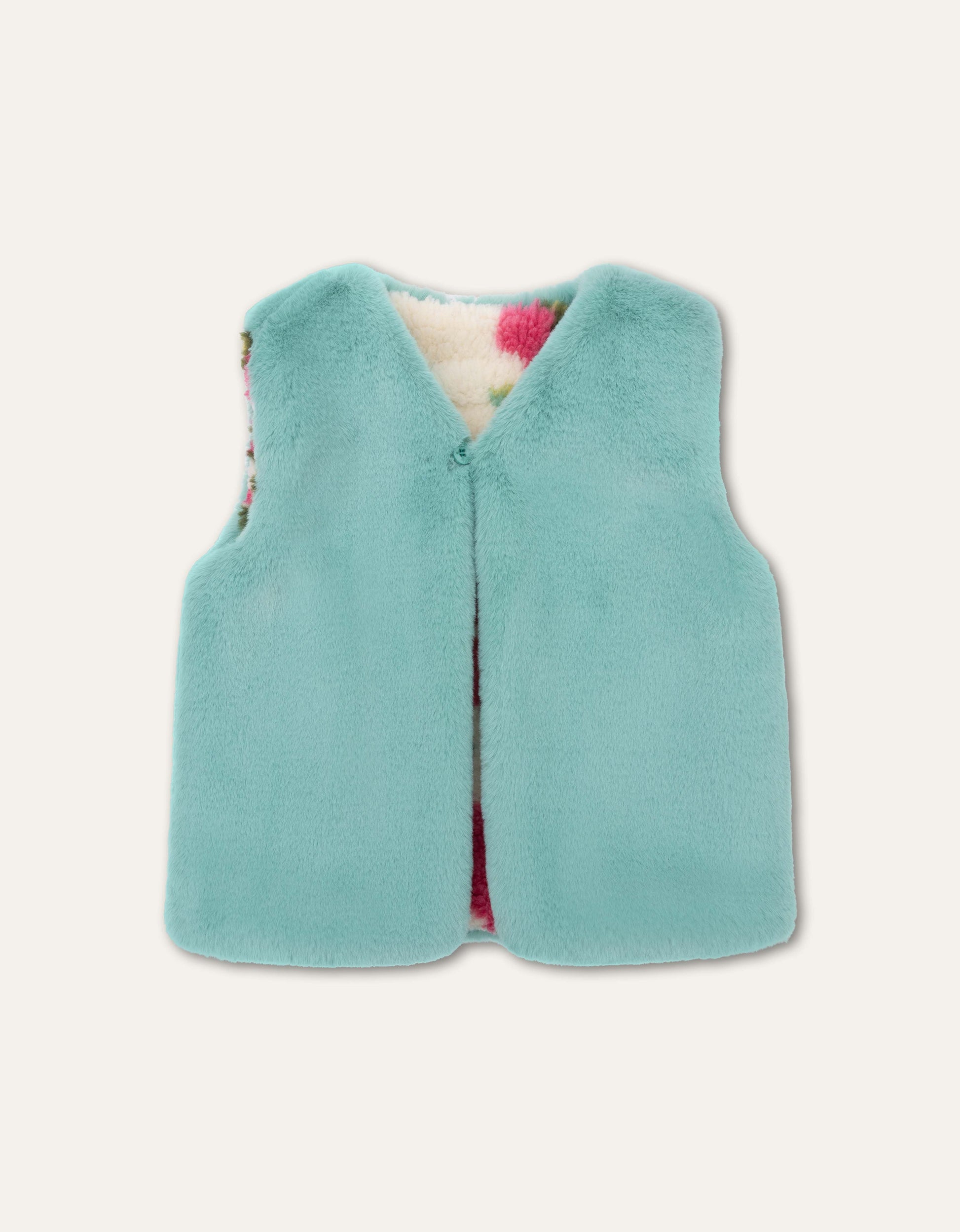 Zachte teddy bodywarmer die ook nog reversible is. Je kan dus kiezen tussen de grote romantische bloemen van print Vroukje met mintgroene accenten of de geheel mintgroene kant.