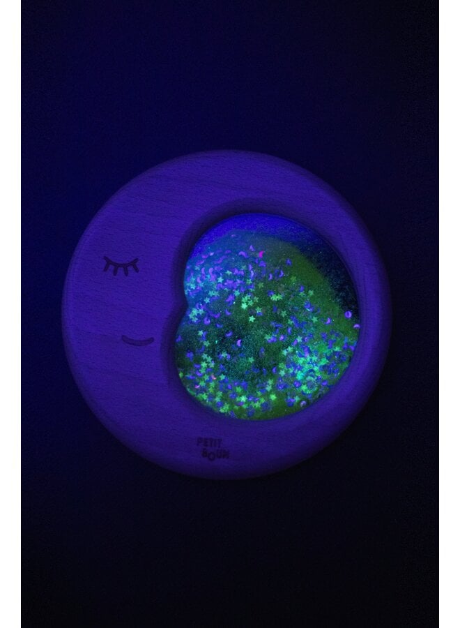 Onze Sensory Moon licht op in het donker: laad hem eerst op onder een natuurlijke lichtbron of blacklight.